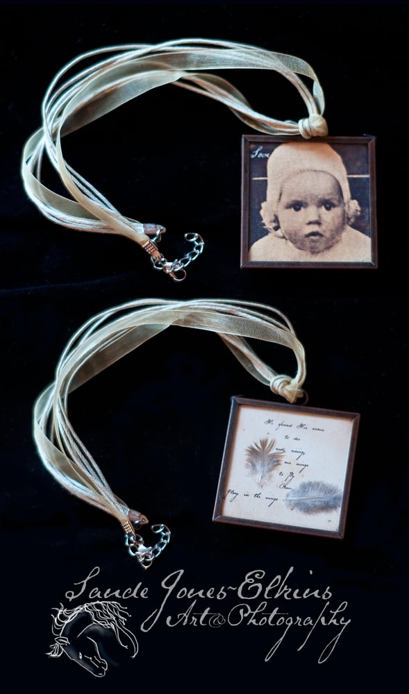 There is a long story behind these pendants. The one shown contains a photo of my mother as a baby. On the back is a poem written for me by my dear friend, Renee Fukumoto: